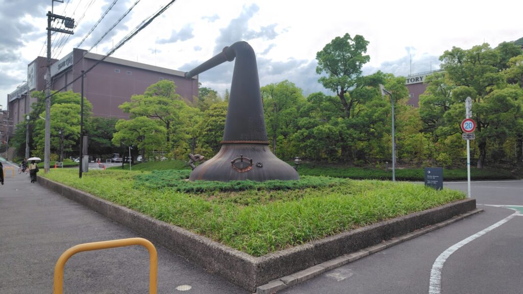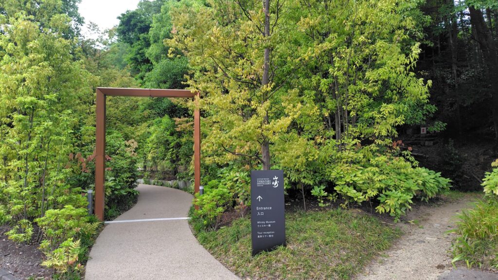 山崎蒸溜所で長年使用されてきた蒸溜釜を再利用した門をくぐり、木漏れ日や季節の移ろいを感じる杜がウイスキー館に誘います。